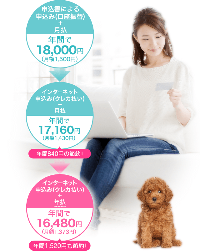インターネットからのお申込み(クレジットカード払)は、お申込みのお手続きにかかる費用のコスト(人件費や郵便費用)が節約できます。そのため、お客さまがお支払いする保険料がお安くなります。