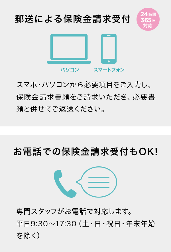 ご契約者さまページから保険金請求に必要な情報をご入力・診療明細書をアップロードいただくことで簡単に保険金請求ができます。